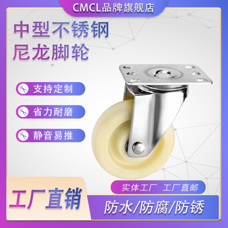 CMCL牌的中型不锈钢尼龙脚轮3寸4寸5寸加硬材质耐磨工业手推车平板车轮子产品:估价:6.00,规格:3寸,产品系列编号:3寸 发布日期:2025-10-31